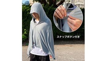 フード付きのポンチョ型で、羽織るだけで頭からしっかり冷やすことが可能。フードの首部分の形状を工夫することで肩にかかりやすく、スナップボタンを留めれば多少の動きでもずれ落ちない。