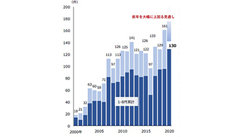 焼鳥店などを含む「居酒屋」の倒産件数は、1~8月の期間で130件に達している。8月の時点で累計100件を超えたのは、2000年以降で初めて。前年同期比で3割多い現在のペースが続けば、20年における居酒屋の倒産件数は、過去最多だった19年の161件を大幅に上回り、過去20年の最多を更新することがほぼ確実となった。
