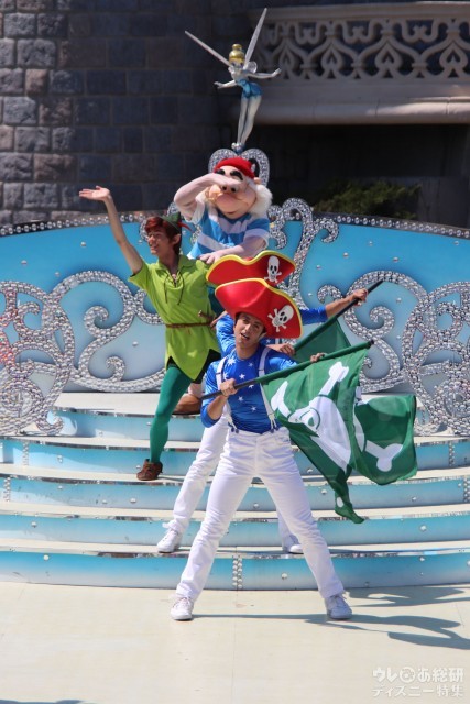 四人の男性ダンサーが海賊帽子や探検家のような帽子をかぶり、グーフィーとマックスが海賊旗を模した旗を振ると、ステージには映画『ピーター・パン』の主人公、ピーター・パンと、フック船長の手下のスミーが現れます!