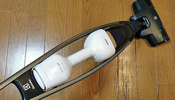 Pure Q9の基本的な設計はエレクトロラックス従来機の延長線上にある。スティックタイプながらバッテリを搭載する中心部分を取り外すことができ、手軽にハンディタイプにスイッチして使用することができる。デザインで大きく異なるのは、外枠のアルミフレームだ。曲線的なデザインが美しいだけでなく、素材の軽さと肉抜きした設計で、軽量化も実現している。