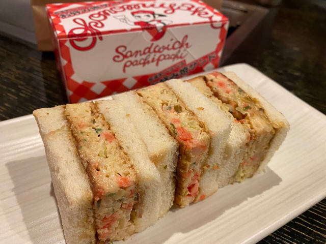 有楽町「お好み焼・鉄板焼88(パチパチ)」のサンドは、場所柄もありテレビや劇場などの差し入れ、ケータリングで多く使用されている事からじわじわ広がり、癖になる人が後を絶たない魅惑の片手フード!
