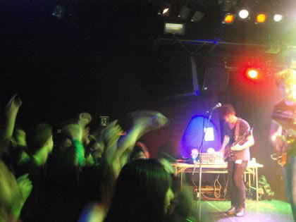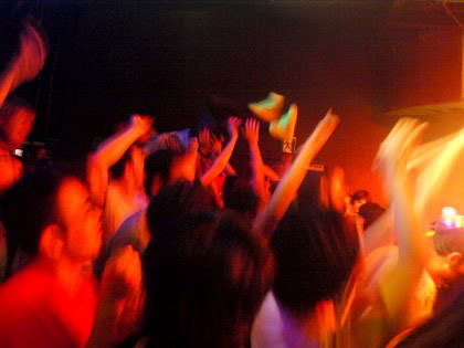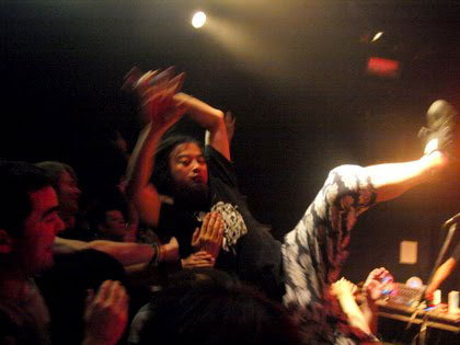 しばらく撮影していた鈴木研究員も、この状況を見ていては居ても立ってもいられず…。安全なところに取材セットを置いて、ではちょっと行ってきます! というわけでモッシュピットの中にドーン! もうなんか人種入り混じりでゴッチャゴッチャのところに突っ込んでいくみんな激しい! 前で飛び跳ねてる白人のお兄ちゃんのエルボーが顎の先端にヒット! 痛い! でも楽しい!!!!