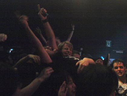 というわけでしばらく暴れまくった後にまた安全地帯に取材セットを取りに行きまして、戻ってきてみれば、すぐそこでクラウドサーフが起きてました! そりゃあ起きるさ! しかしみんなノリ良いんですよねー。何度も言いますが最高ですこの雰囲気!