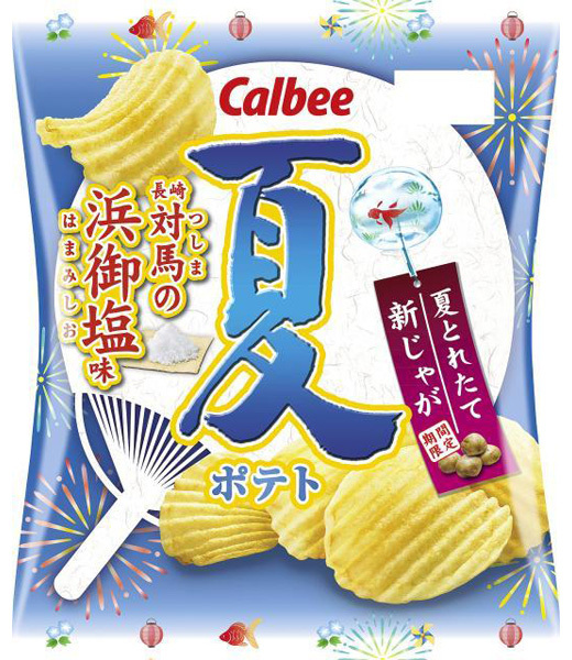 期間限定のカルビーの「夏ポテト」は、「対馬の浜御塩味」と「紀州の南高梅」の2種。おいしい海塩「浜御塩」を使用した「対馬の浜御塩味」は、キリッとした塩味が後を引くおいしさ。一方、「紀州の南高梅」はさっぱりしたおいしさ。どちらもビールに合いますよ!