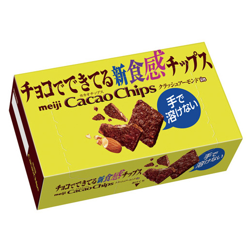 チョコ+クラッシュアーモンドの「カカオチップス」は、かなり濃厚。それもそのはず、ほとんどがチョコレートでできています。もちろん、手で持っても溶けないので、場所を選ばず食べられます。