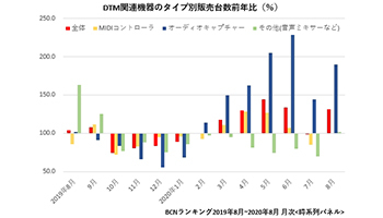 コロナ禍で生まれたテレワーク需要や巣ごもり需要で、売り上げを伸ばしている製品群の一つがDTM(Desk Top Music)関連機器だ。コンピューターを活用した音楽制作用機器を中心とした市場だが、好調を維持している。特に、販売が伸びているのはオーディオキャプチャー(オーディオインターフェース)。BCNランキングの集計では、3月に前年比149.7%と売り上げが急増。5月に204.6%、6月に228.6%増と倍増以上の勢いだ。