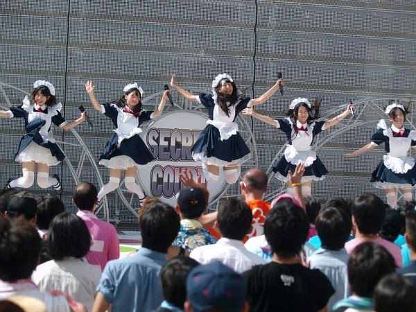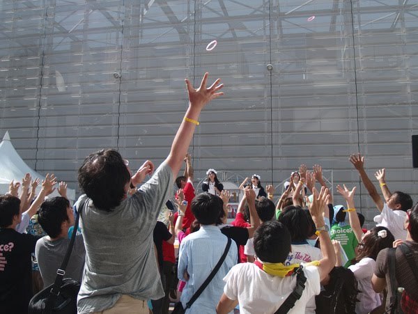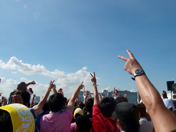 さぁそろそろSKY STAGEに上がるか…と階段を踏みしめ、天上世界に足を踏み入れます。このときパフォーマンスしていたのは、先ほどのナイスガールトレイニーちゃんたちの先輩、「THE ポッシボー」で、まぁもう人の数も太陽光線もハンパじゃありません。今回も遠目ショットで失礼いたします!