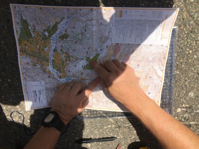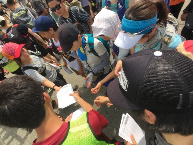 スタート30分前になるとブリーフィングが行われ、得点表も配布されます。どのチームも急いでコースを再設定。地図を読み、より多くの点数を稼ぐためにはどのようなコースが最適なのかを話し合います。この設定をミスしてしまうと、とんでもなく効率の悪い走り方になってしまうので、どのチームも真剣。