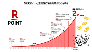 楽天は、提供するポイントプログラム「楽天ポイント」の累計発行ポイント数が2兆ポイントを突破したと9月24日に発表した。官民挙げてのキャッシュレス決済の普及促進に向けた施策を受け、ポイント経済圏の拡大が加速。2019年は、年間3200億ポイント以上発行する規模となった。1ポイント1円相当として利用できるので、全て買い物やポイント投資に利用されたと仮定すると、1年間で3200億円相当、過去16年で2兆円相当の経済効果を生み出したといえる。