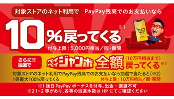 ペイペイジャンボとまたまたオンラインがお得!10%戻ってくるキャンペーンは、指定のオンラインストアで決済すると必ず10~20%が戻ってきて、しかも抽選に当たれば追加で決済金額の全額もしくは10%が戻ってくるというもの。