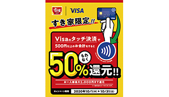 ゼンショーグループのすき家が展開する牛丼チェーン店「すき家」は、10月1日から「Visaのタッチ決済」で500円以上支払うと、もれなく50%キャッシュバックするキャンペーンを実施する。キャンペーン期間は、10月31日23時59分まで。