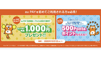 新規登録者限定で、「はじめよう au PAY!1,000円(相当)分の残高プレゼント」として、au PAY(コード払い)の利用開始登録を初めて行うと、1000円分のau PAY残高をプレゼントする。条件は、キャンペーン期間中にau PAY(コード払い)利用規約に同意することと、au IDとPonta会員IDの連携を行うこと。特典は原則、条件達成の2日後までに付与する。