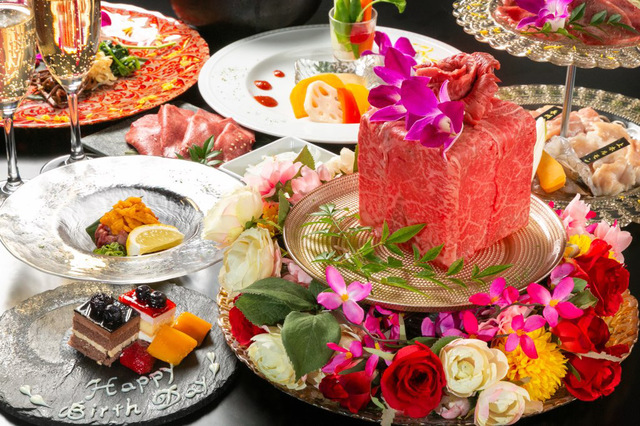 雲丹が乗った炙りユッケや当店人気のタンの食べ比べ、肉ケーキでお祝い焼肉が楽しめます。無料の花火とプレートが付きます。