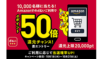 NTTドコモは10月1日、ドコモ回線契約者向けに、最大2万円相当がdポイント(期間・用途限定)で戻る「Amazon d払いdポイント50倍還元チャンスキャンペーン」を開始した。キャンペーン期間は10月1日~10月31日23時59分。