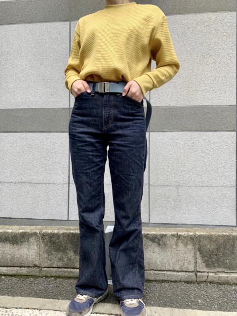 レディースウォームワッフルクルーネックを着用したおすすめコーデは、デニムとスニーカー、そして先ほどの綿バックルベルトとの組み合わせ。