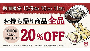 丸亀製麺は10月9日にうどん・天ぷら・丼・いなりを税込1000円以上テイクアウトすると、会計金額から20%割り引くキャンペーンを実施する。