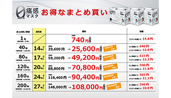 サムライワークスは、特殊技術で耳ヒモに超広幅1.5cmのやわらかストレッチを採用した耳が痛くならない超やわらかマスク「ゼロ痛感マスク」のまとめ買い販売を10月8日に開始した。1箱(50枚入り)の税別価格は740円(1枚当たり14.8円)だが、40箱(2000枚)なら2万5600円(同12.8円)、80箱(4000枚)なら4万9200円(同12.3円)で販売する。