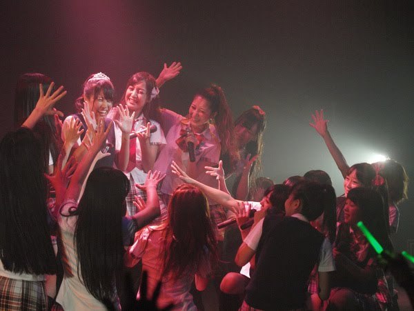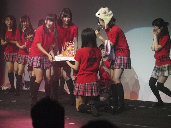 そんな男子の心をギュッと掴んで離さないももまゆちゃんなんですが、実は女の子が大好き!MCコーナーでゆうみんのほっぺにちゅーっ!っとやってたりして、もう会場ため息ですよ!二人とも可愛すぎるんですよ!あと、ももまゆちゃんって声が揺れる感じで独特の発声法なんですけど、みんなでそれを真似しまくっててホント愛されてるなーって感じでした。そうそう、ももまゆ生誕公演開始のタイミングで、総長ことLinQリーダー上原あさみさんが関係者席に登場!「LinQのママが来ています!」と呼ばれるとメンバーから「ママー!」「お母さーん!」の大合唱が…。美人母すぎるじゃないですかもう!続いて『カロリーなんて』と『チャイムが終われば』もももまゆシフトでパフォーマンス、さらにバースデイパーティに移りましょう。かわいいリラックマ帽子で登場のももまゆちゃん、ファンの方から特大のケーキ&飴細工が!もうどんだけ匠の技なんだ!