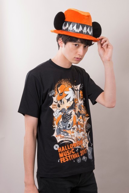 黒地にフェス風のイラストがかわいいTシャツと、ミッキーとお揃いのファンキャップ。