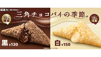 日本マクドナルドは、本日(10月14日)から、「三角チョコパイ 黒/白」を10月14日から期間限定で販売する。どちらもチョコクリームが10%増量されており、史上最大のチョコクリーム量になっている。