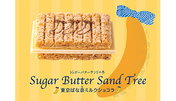 シュガーバターサンドの木 東京ばな奈ミルクショコラは、“おいしいとこどりの、バナナミルキーバターリッチ!”をテーマに、東京ばな奈の美味しさを再現したバナナミルキーショコラを、シュガーバターの木自慢のバターリッチな香ばし生地ではさんだごちそうサンド。