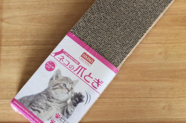 ダイソーの段ボール製の爪とぎは厚みがあり、裏表が使えるのでリーズナブル。猫が大好きなまたたびの粉も付属しています。