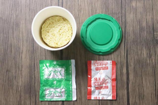 中にはかやくと後入れ粉末スープが入っていました。作り方は一般的なカップラーメンと全く同じようですね。麺は軽めで、一本一本が細い印象を受けました。