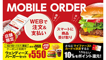 なお、10月19日から11月1日まで、期間限定でキャンペーンを実施する。モバイルオーダー限定で、ウェンディーズバーガーセット550円の特別クーポンが利用可能となる。また、モバイルオーダーでのマイファーストカード決済で10%ポイント還元を行う。
