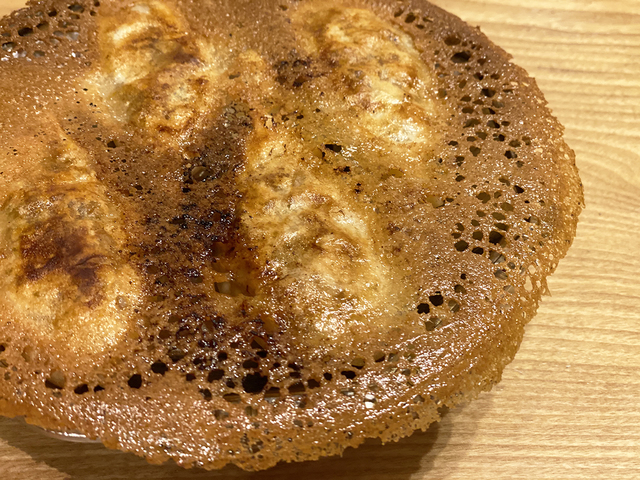 小ぶりな餃子にパリッパリで薄めの羽が網目のように美しく一体化!そして餃子も美しくジューシーです。