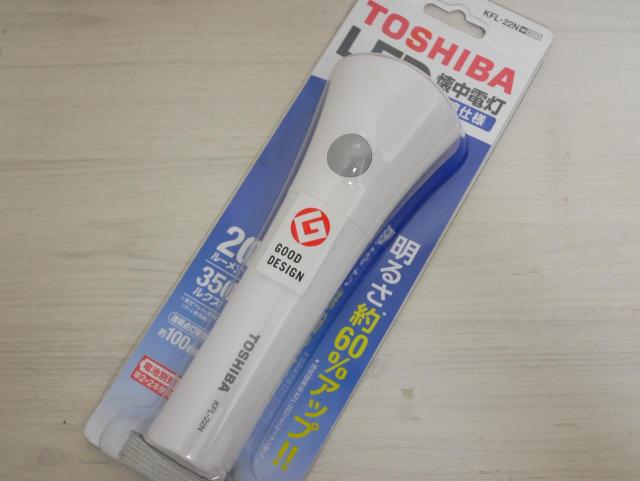 これは、東芝製のLED懐中電灯で防滴仕様。水害時にも使えるとても便利な懐中電灯。明るさが高いため、機能性も高く、連続使用で約100時間使用できるため、機能性も高いです。