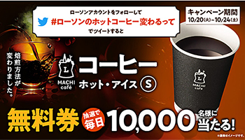 ローソンは10月20~24日の5日間限定で、MACHI cafeのコーヒー1杯(ホット・アイスS)無料引換券が毎日1万人、計5万人に当たる「#ローソンのホットコーヒー変わるって」Twitterキャンペーンを実施している。マチカフェは、ホットコーヒーをリニューアルし、「マチカフェ史上最高のコク」を売りにしている。