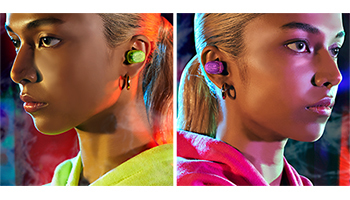IE-FBKは、DJ DARUMAが刺激を受けた90年当時のキャンディカラーのポップさとスケルトンをデザインに取り入れた、Bluetooth 5.0対応完全ワイヤレスイヤホン。イヤホン本体だけでなく、充電ケースも一貫してスケルトン化した。