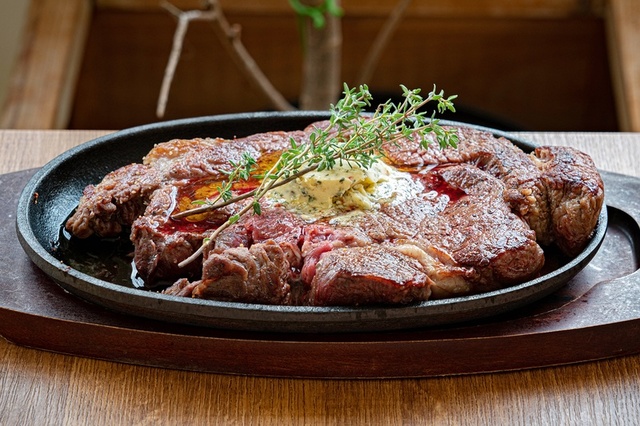 熱々に熱したステーキ鉄板皿にバターを溶かし、表面をカリッと香ばしく焼き上げています。
