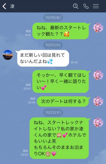 答えに困って未読のまま返信をしないでいたら、『△△(※海外ドラマのタイトル)ナイトしない?私の家か〇〇くんの家で。ホテルでもいいよ(笑)もちろんそのままお泊まりOK』とデートの妄想LINEが…!
