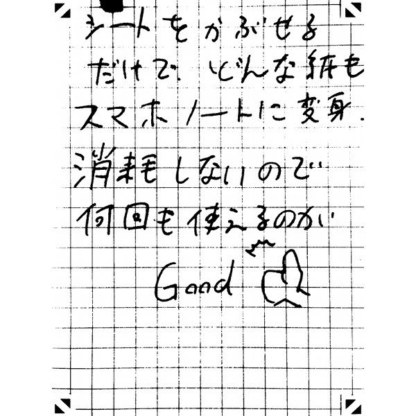 シートを使ってスキャンするので、他のノートと違い消耗しない、というのが特徴。スマホノートは通常のノートより割高なことが多いので、とっても経済的です。ただし、画像の仕上がりは下地となるノートに左右されそうなので、使うノート選びは慎重になって方がいいでしょう。ここでは無地か罫線の薄いノートが良いと思います。