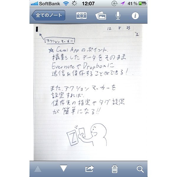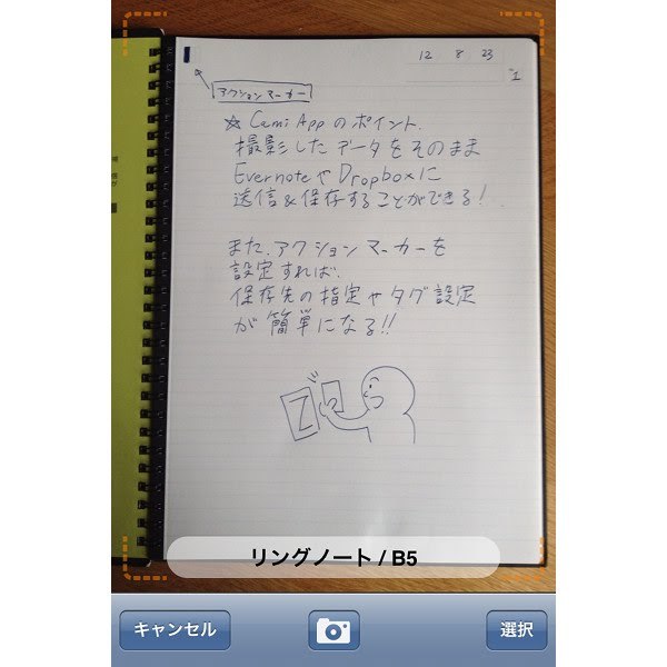 アクションマーカーを使用した場合は、撮影した瞬間にデータが保存先にアップされます。このスピード感はいいですね。ノート補正の仕上がりですが、色味がやや残念といったところ。色調加工があまいのか、ただノートをカメラで撮っただけ、といった印象を受けます。