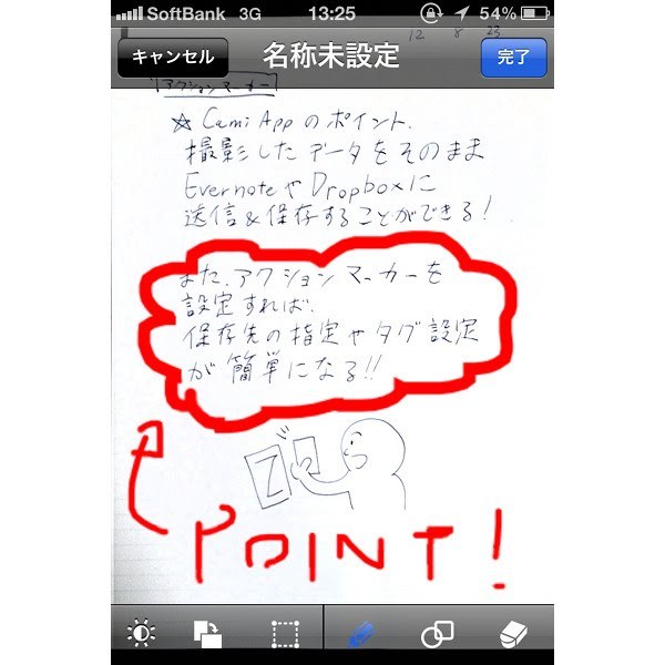 データは明度を手動で調整することもできます。また、ペンで画像の上からメモを書き込むことも可能。強調したい部分を赤丸で囲む、なんて芸当も。これは便利ですね。
