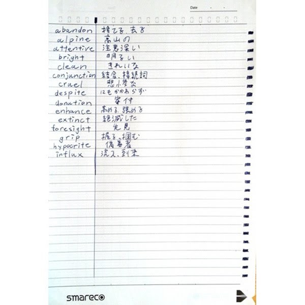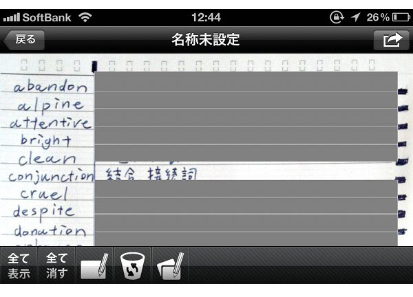 すると!データ化されたノートは分割マークにそって、ブラインド範囲が設定されます。ブラインド部分をタッチすると、グレーのカバーが外れて、答えが現れるという仕組みです。これで自作の英単語練習帳の完成です!ただ、よく見るとちょっと罫線とグレーの部分がずれているような気が……。ううむ。