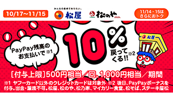 松屋フーズが展開する店舗で、スマートフォン決済サービス「PayPay」がお得なキャンペーンを実施している。11月13日までは10%還元で、14日と15日は15%還元になる。対象店舗は、松屋、松のや、松乃家、マイカリー食堂、松そば、ステーキ屋松のうち、キャンペーン専用のPOPなどが掲出されている店舗だ。