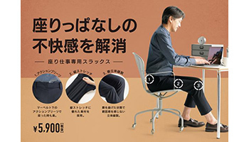 一般的なウール/ポリエステル混紡生地を使用した場合、“横方向”へのストレッチ性が主流だが、すわりシゴト専用パンツは独自の織り・仕上げ技術の生地によってウール/ポリエステル混紡生地でありながら“縦方向”に約14%のストレッチ性を実現している。同社の従来品と比べて、約1.4倍のストレッチ性で、着席時の下半身の窮屈感を緩和するという。