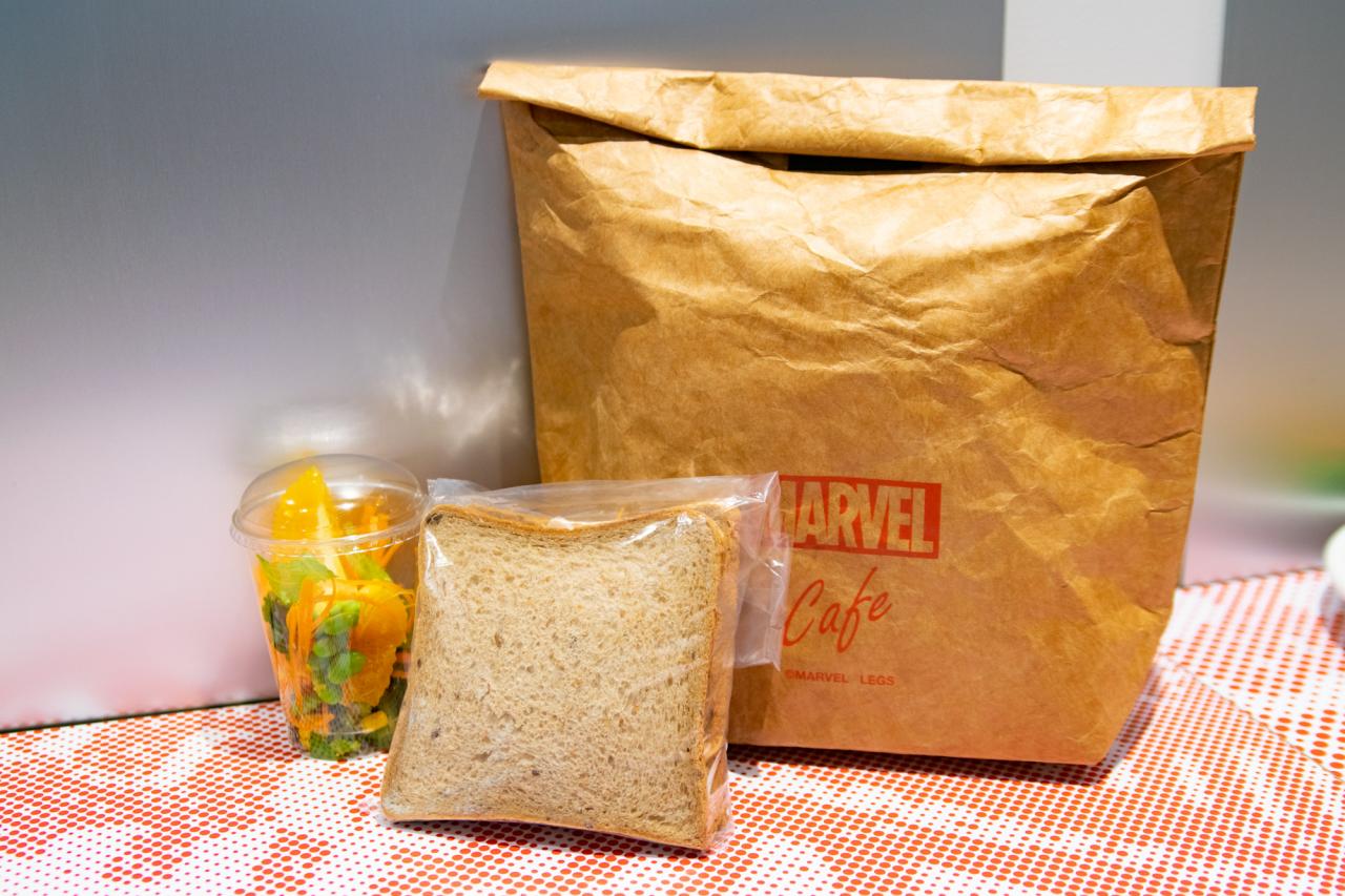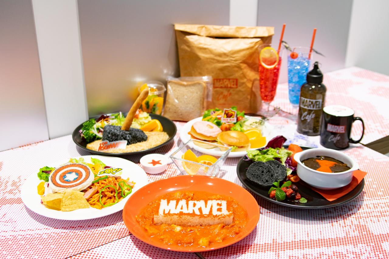 MARVELロゴやムジョルニアを模したものなど、見た目にこだわったメニューや、ピーター・パーカーがいつも注文するサンドウィッチや『アイアンマン2』のトニーのドーナツ風ベーグルサンドなど、作品の世界観にこだわったメニューが登場。