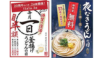 第2弾企画では、寒い夜にうどんを食べることで身体をあたためる「夜なきうどん」という食文化を知ってもらい、夕食にも気軽にうどんを楽しんでほしいという想いを込め、11月7日の立冬の日を「夜なきうどんの日」と制定。「夜なきうどんの日キャンペーン」として11月6~8日の3日間限定で17時から、好きなうどん全品「並」サイズを注文すると無料で「大」サイズへ麺を増量して提供する。