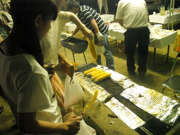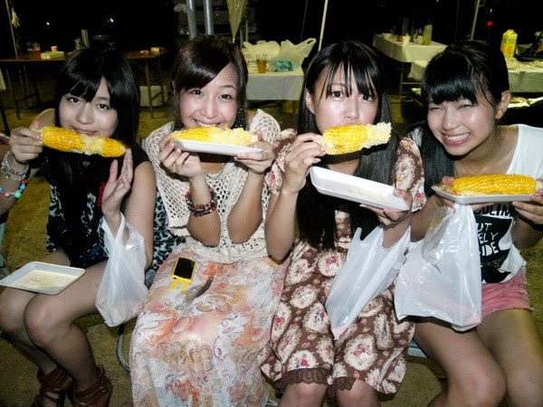 鈴木が神楽に密着取材している間にLinQメンはお客さんとコミュニケーションタイム!いつものファンの方ばかりじゃなくて、今日だから来た!という感じのお客さんも多かったみたいです。そこから一度控え室に戻って、私服で再集合!数人ずつに分かれて、お祭り会場を散策いたします。完全にフリーダムになってしまうといろいろと大変なので、スタッフさんが各組に付き添うんですが、鈴木もピンチヒッターで付き添い係を仰せつかりました。写真は焼かれるとうもろこしを食い入るように見つめる天野なっちゃん、そして本当に食い入ってしまうメンバーの4人であります。いいなーとうもろこしなー夏だよなー。