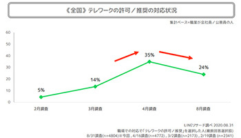 LINEリサーチは、新型コロナウイルスの感染拡大によって企業や人々の生活にどのような変化が起きているかを定期的に調査し情報発信している。第5回目の調査(8月31日実施)の中から、テレワークの実施状況を、過去調査からの推移を踏まえて結果を発表した。それによると「テレワークの許可/推奨」を行っている職場は、全国で24%となった。最も高かった前回調査(4月)時点の35%からは11ポイント減少している。4月の緊急事態宣言では、緊急避難的に急激に拡大したテレワークだったが、そこから4か月経過し、新しい生活様式(ニューノーマル)にも慣れて再度調整がかかっていることが考えられる。
