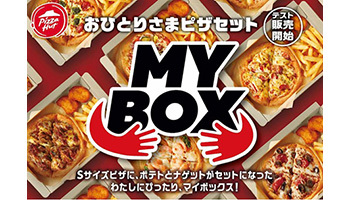 MY BOXは、食べ切りサイズのピザ(Sサイズ)とハットフライポテト、チキンナゲットがセットになっている。1人でもピザ以外の料理を食べたいというニーズに応えている。セットメニューが1箱に収まる専用のBOXで提供し、持ち運びにも便利。世界各国でのMY BOXの人気を受け、日本で発売となった。