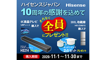 ハイセンスジャパンは、創立10周年を迎えたことを記念したキャンペーン「ハイセンスジャパン 10周年記念キャンペーン」と「ハイセンスジャパン 10周年Twitterキャンペーン」を11月4日に実施する。