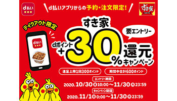 NTTドコモは、エントリーの上、d払いアプリの「すき家のテイクアウト」から予約・注文すると、d払いの利用額に応じてdポイント(期間・用途限定)で1回最大300ポイント付与する「d払いの予約・注文限定!すき家+30%還元キャンペーン」を11月1日~30日に実施する。期間中のポイント付与上限は600ポイント。