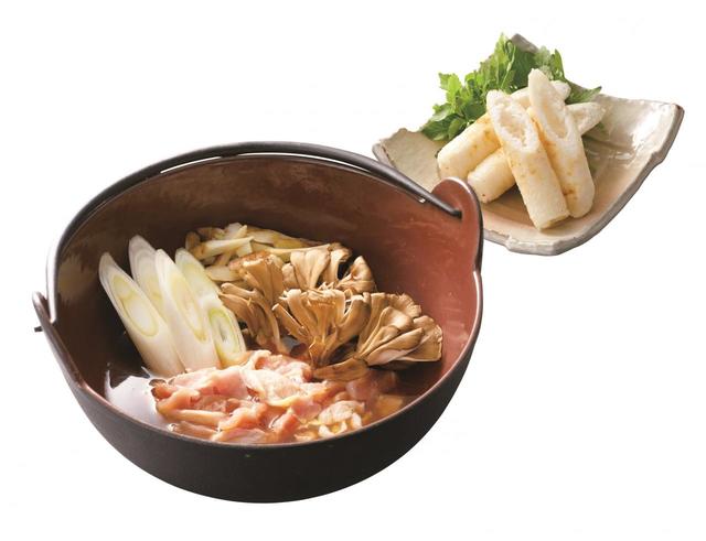 秋田県のご当地鍋。「きりたんぽ」とは、つぶしたうるち米を棒に巻いて焼いた筒状のもので、秋田県の郷土料理の一つ。比内地鶏スープで、鶏肉やせり、ささがきゴボウと一緒に楽しめます。