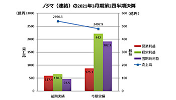 ノジマの2021年3月期第2四半期(2020年4月1日~9月30日)連結決算は、売上高が2407億8700万円(前年同期比10.7%減)、営業利益が175億500万円(同49.2%増)、経常利益が441億9900万円(239.1%増)、親会社株主に帰属する四半期純利益が382億6900万円(313.6%増)だった。