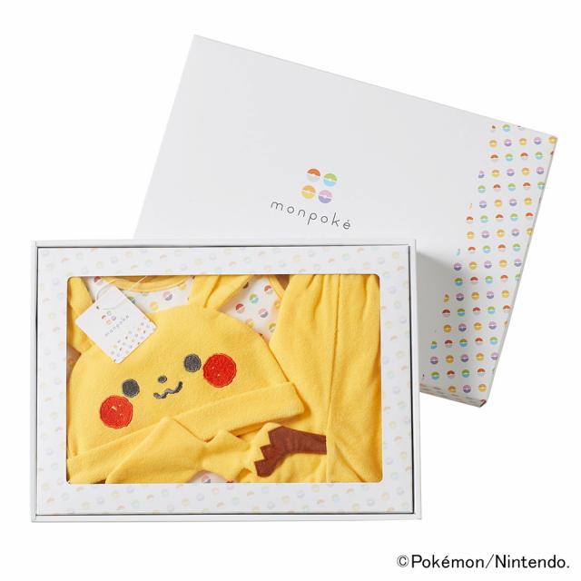 ピカチュウの帽子とエプロンスーツのギフトセット。パンツにはピカチュウのしっぽが可愛くついていて、ギフトにぴったりな上に、写真撮影のときにも使えそう。